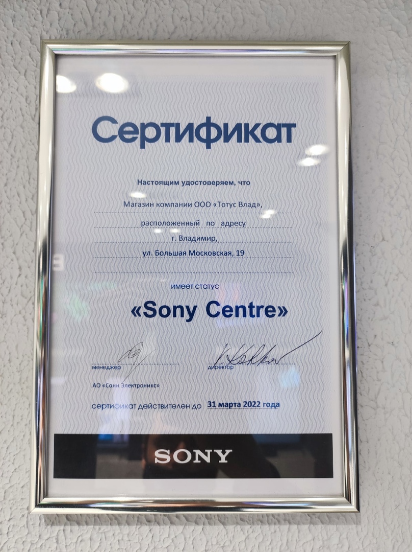 Сертификат соответствия – документ, подтверждающий, что магазин компании ООО "Тотус Влад", расположенный по адресу г. Владимир, ул. Большая Московская, 19 имеет статус "Sony Centre"